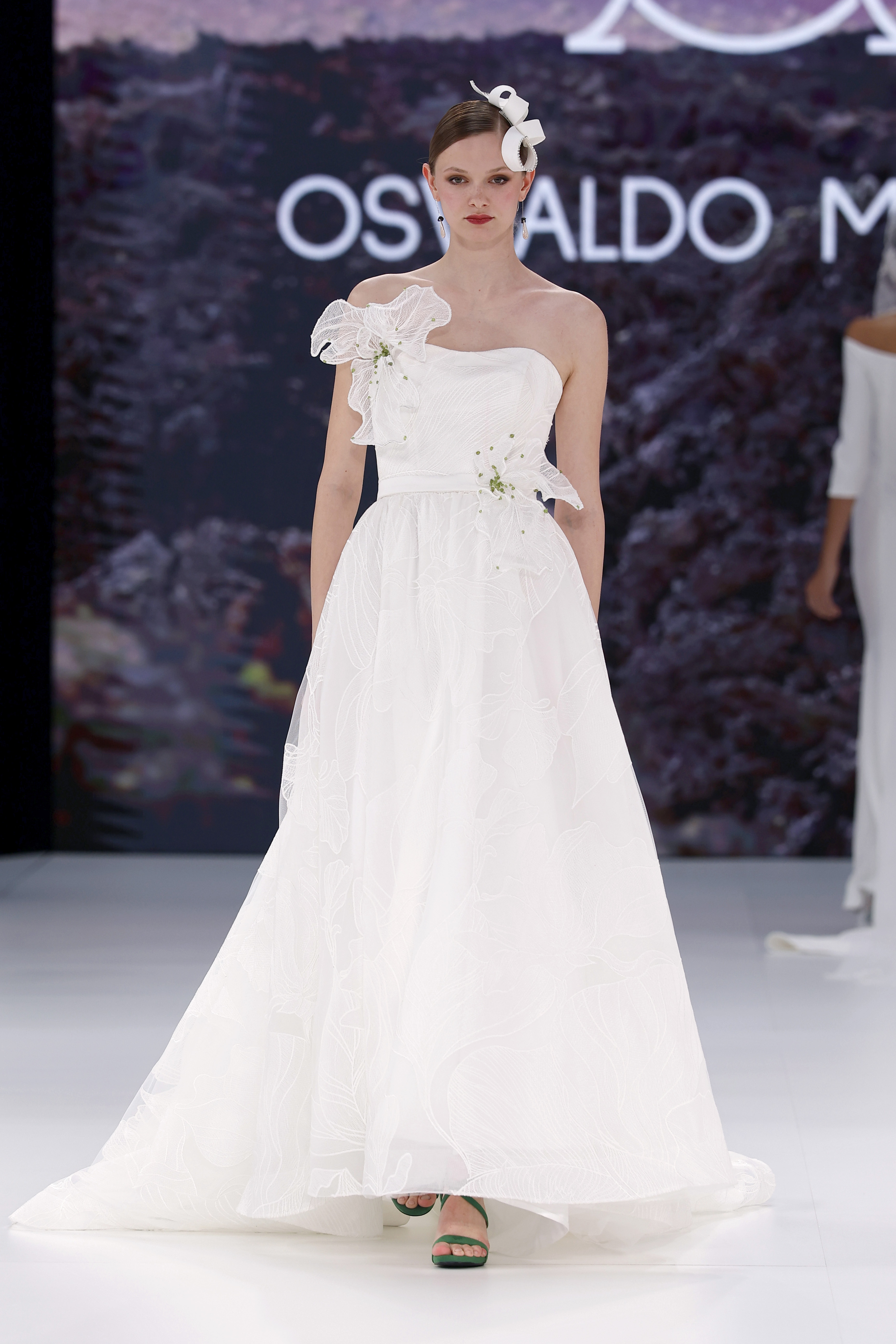 Cada detalle cuenta la historia de Lanzarote: los blancos inmaculados de sus construcciones, los toques de verde inspirados en sus ventanas, la delicadeza de los encajes bordados. La alta costura se manifiesta en los bordados de cristal y piedra de Olivina, en la fusión de cortes princesa con encajes de fantasía, y en la artesanía del calado canario presente en los puños. Las transparencias sutiles añaden un toque de sofisticación, manteniendo la identidad única de Oswaldo Machín.