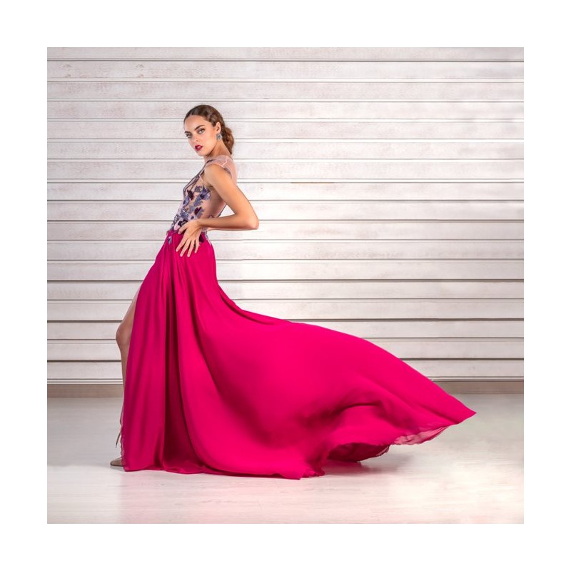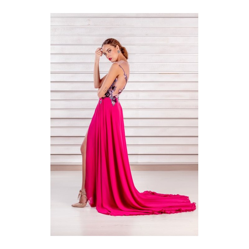 Vestido escote redondo con maxi escote en V en la espalda. Costadillo con volante que forma manga. Falda recta con abertura trasera, en tafeta con colorido.