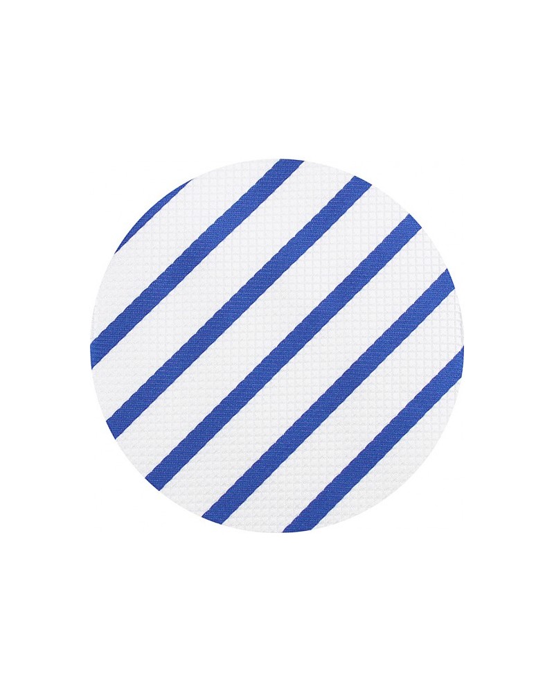 Traje de novio de tres piezas en azul eléctrico con pantalón y chaqueta a juego, camisa blanca para mantener una cromática adecuada y tirantes y pajarita estampado en tonos similares.