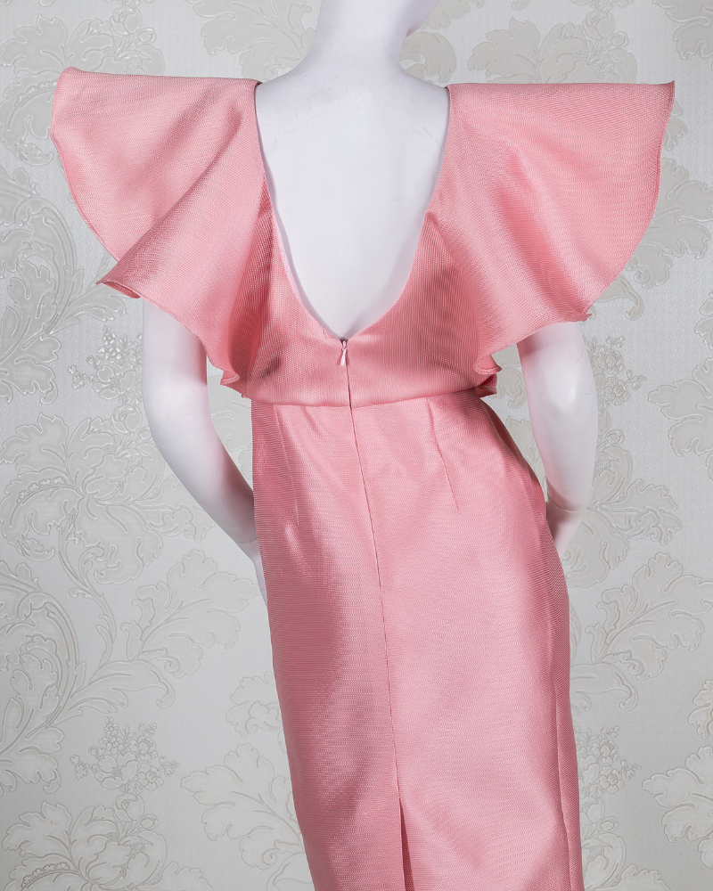 Vestido escote redondo con maxi escote en V en la espalda. Costadillo con volante que forma manga. Falda recta con abertura trasera, en tafeta con colorido.