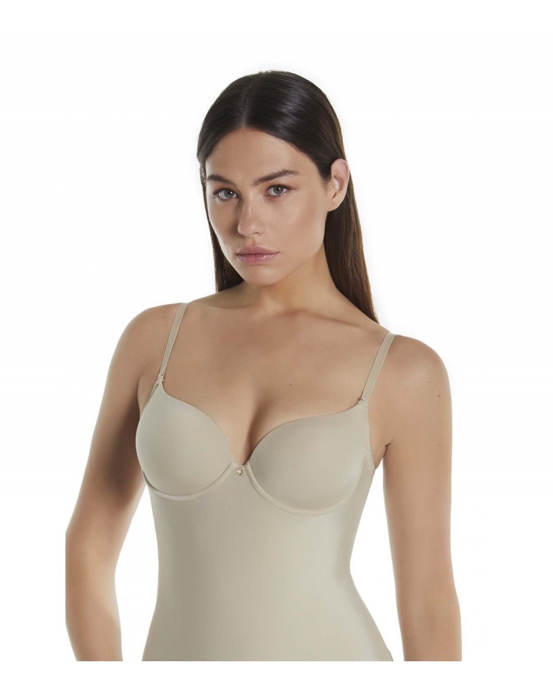 Vestido de novia silueta sirena con cola y escote en V. Confeccionado en tejido blanco y tul, con preciosos encajes de hojas y flores tono sobre tono. Falda con encajes y enriquecida con perlas.