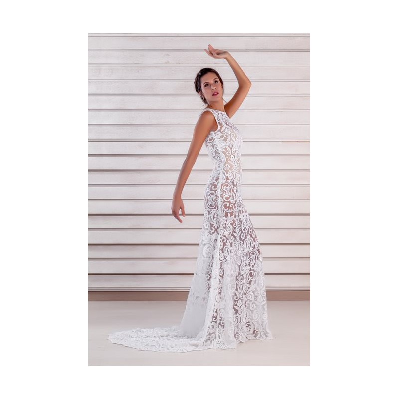 Vestido de novia semitransparente bordado con escote ovalado sin mangas y falda entallada hasta la zona de la zona media de las piernas en la que se forma un evasé con media cola.