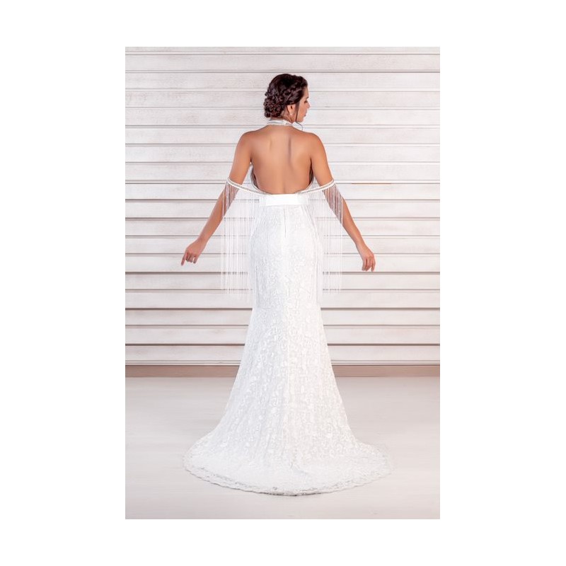 Vestido de corte sirena, hasta rodilla desde donde parte capa son superposiciones de pañuelos de tul mórbido . Vestido escote V en crep georgette con bordado en relieve y fleco de canutillo de cristal en hombro. Escote delantero y espalda con tul color piel y abotonadura central.