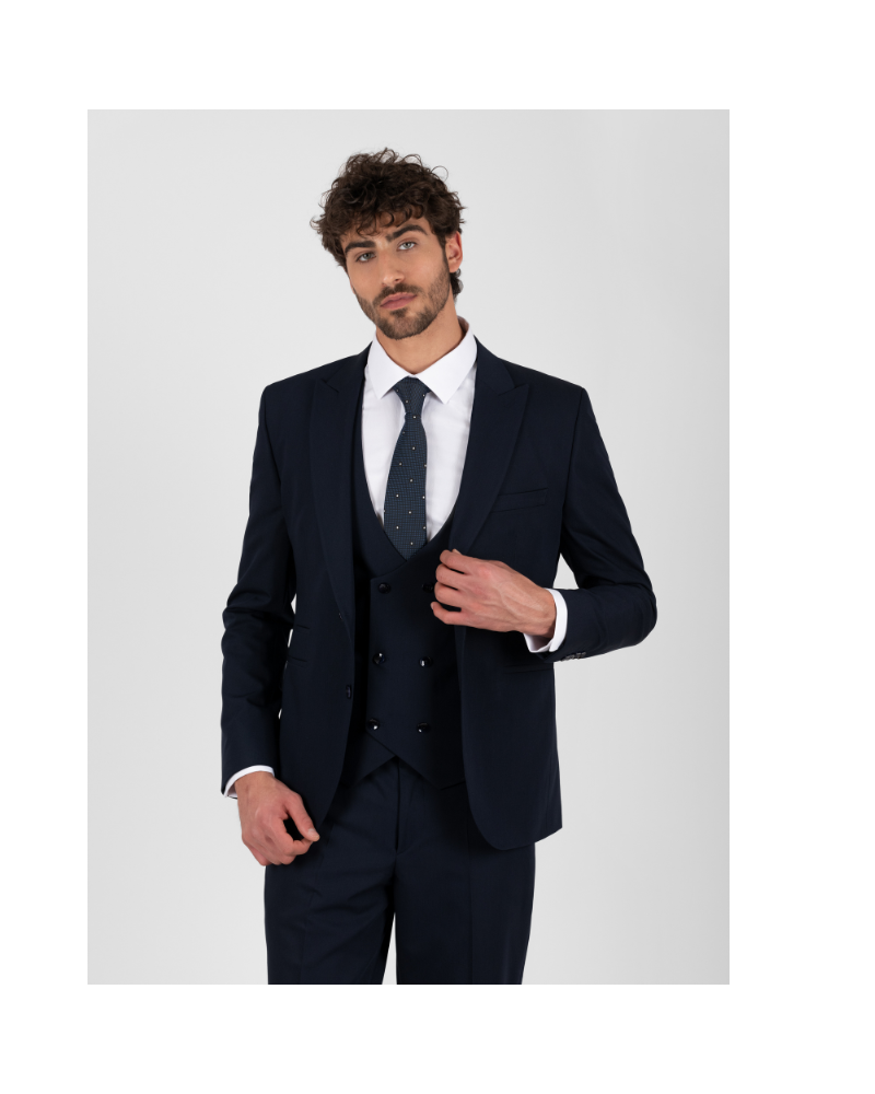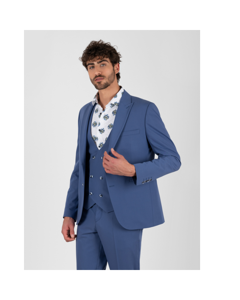 Conjunto de caballero para conseguir un look atrevido compuesto por pantalón de corte slim fit. Chaleco cruzado de 6 botones. Blaizer con solapa clásica con doble botón.