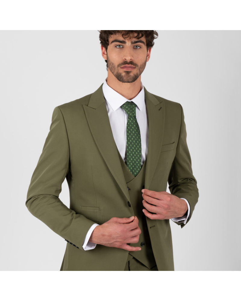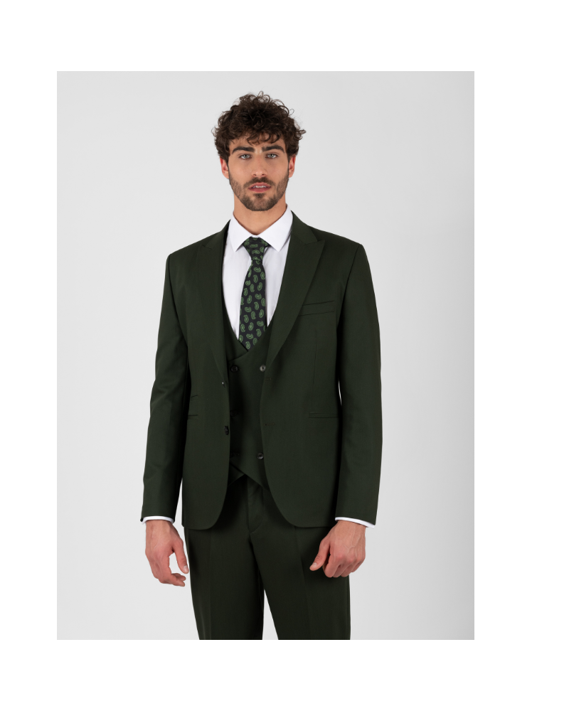Traje de novio de tres piezas en verde pino con pantalón y chaqueta a juego, camisa blanca para mantener una cromática adecuada y chaleco y corbata estampado en tonos similares.