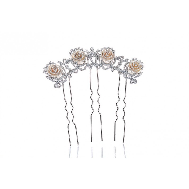 Diseño de enredadera de rosas de porcelana con hojas metálicas para sujetar en el pelo en formato peina.